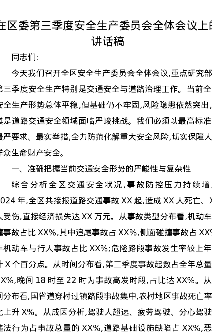 在区委第三季度安全生产委员会全体会议上的讲话稿