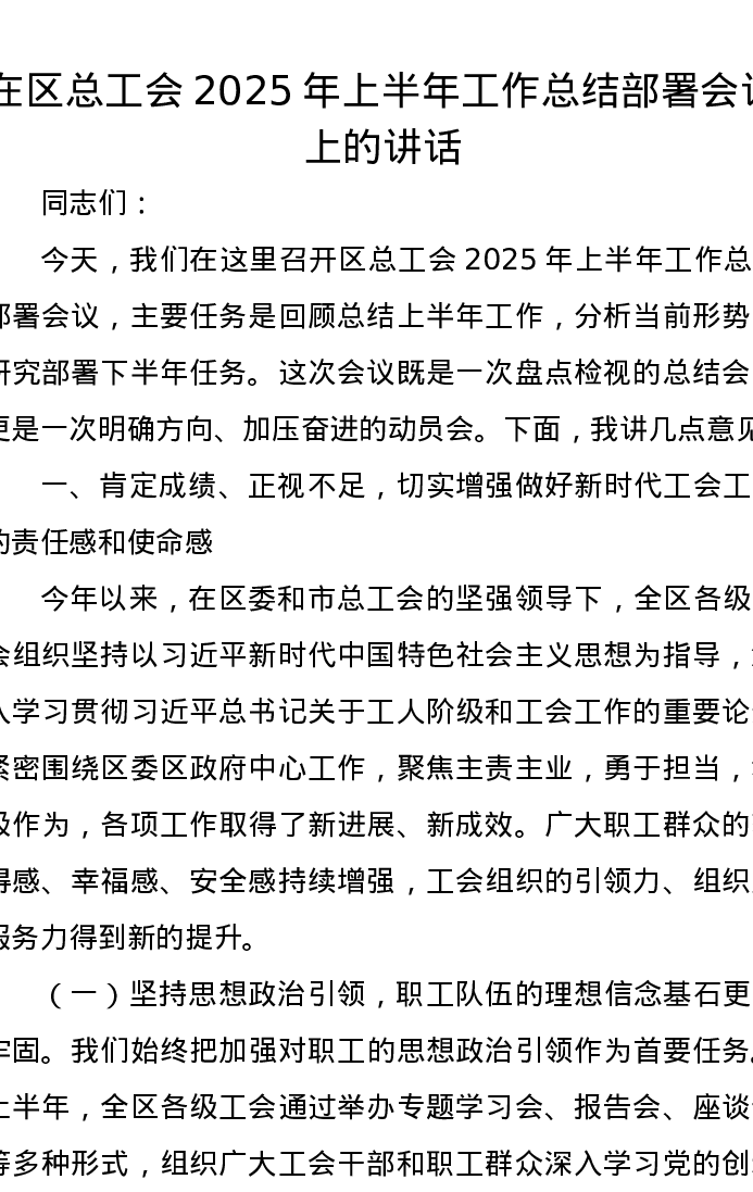 在区总工会2025年上半年工作总结部署会议上的讲话