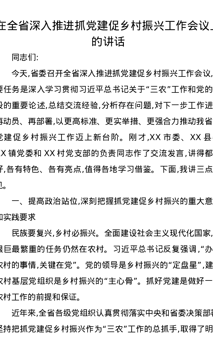 在全省深入推进抓党建促乡村振兴工作会议上的讲话