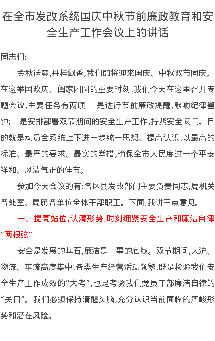 在全市发改系统国庆中秋节前廉政教育和安全生产工作会议上的讲话