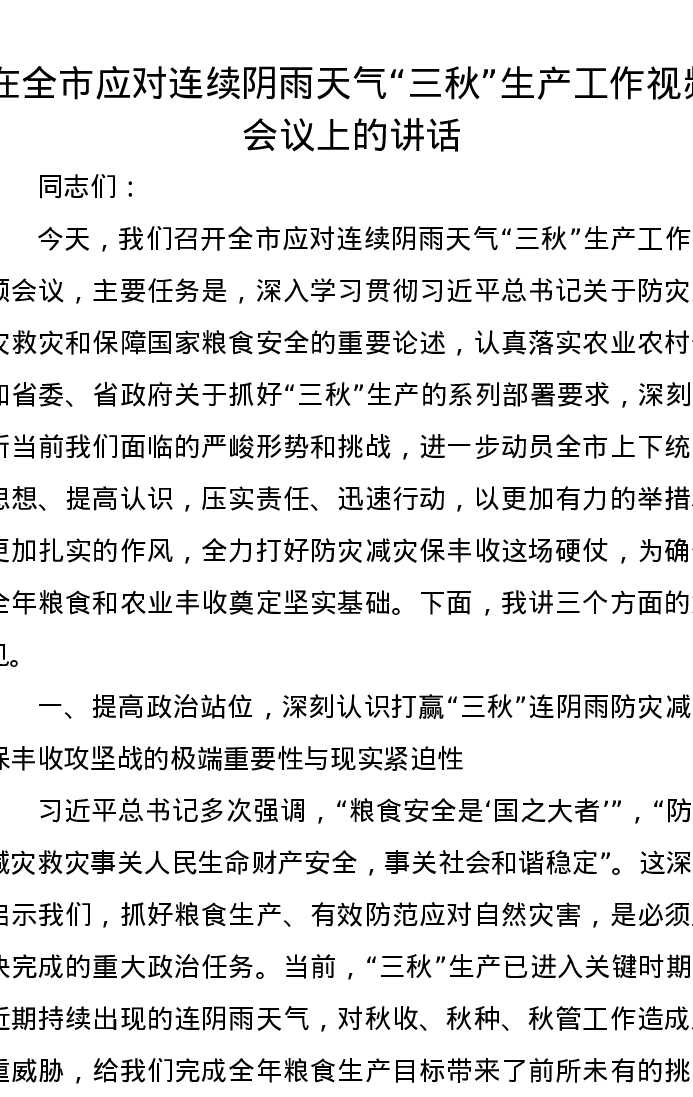 在全市应对连续阴雨天气“三秋”生产工作视频会议上的讲话