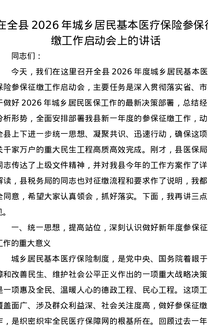 在全县2026年城乡居民基本医疗保险参保征缴工作启动会上的讲话