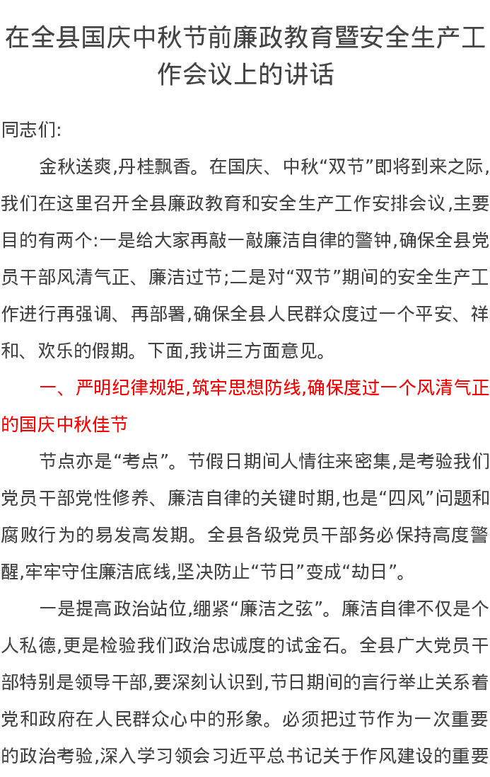 在全县国庆中秋节前廉政教育暨安全生产工作会议上的讲话