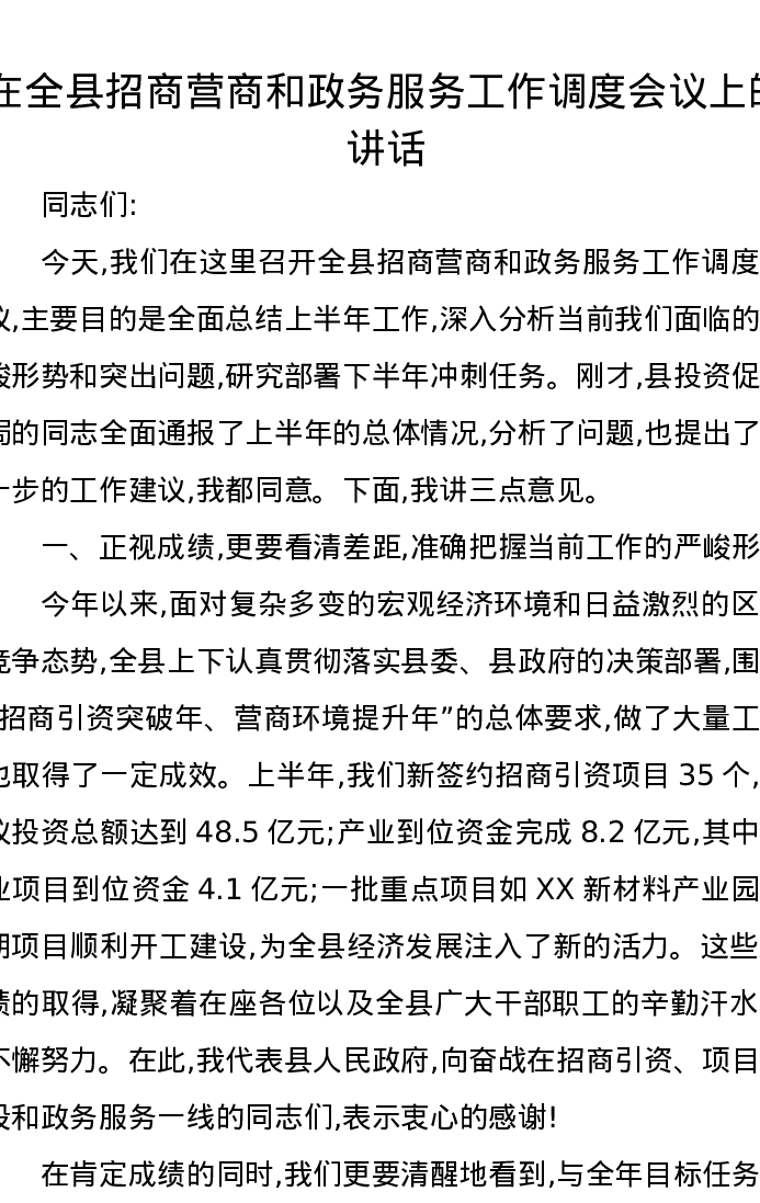 在全县招商营商和政务服务工作调度会议上的讲话