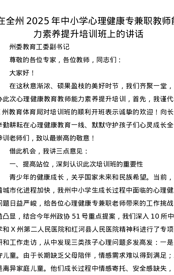 在全州2025年中小学心理健康专兼职教师能力素养提升培训班上的讲话