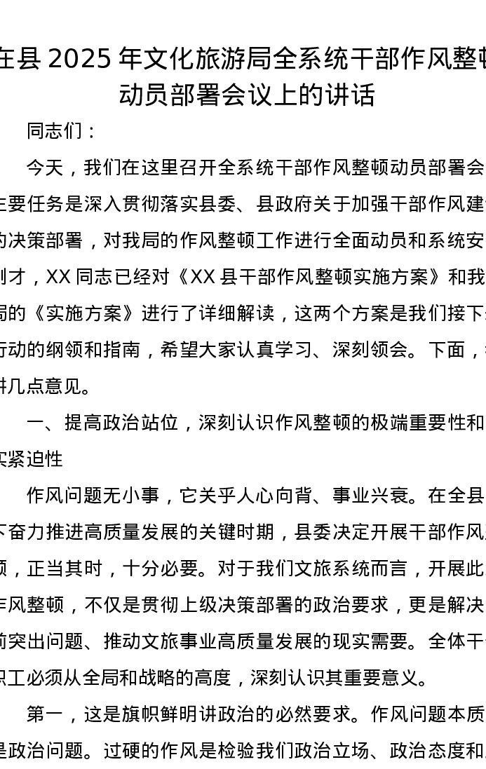 在县2025年文化旅游局全系统干部作风整顿动员部署会议上的讲话