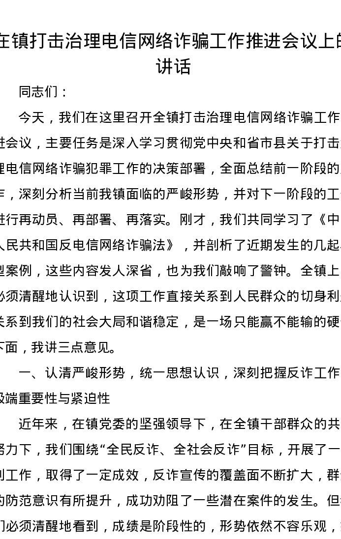 在镇打击治理电信网络诈骗工作推进会议上的讲话