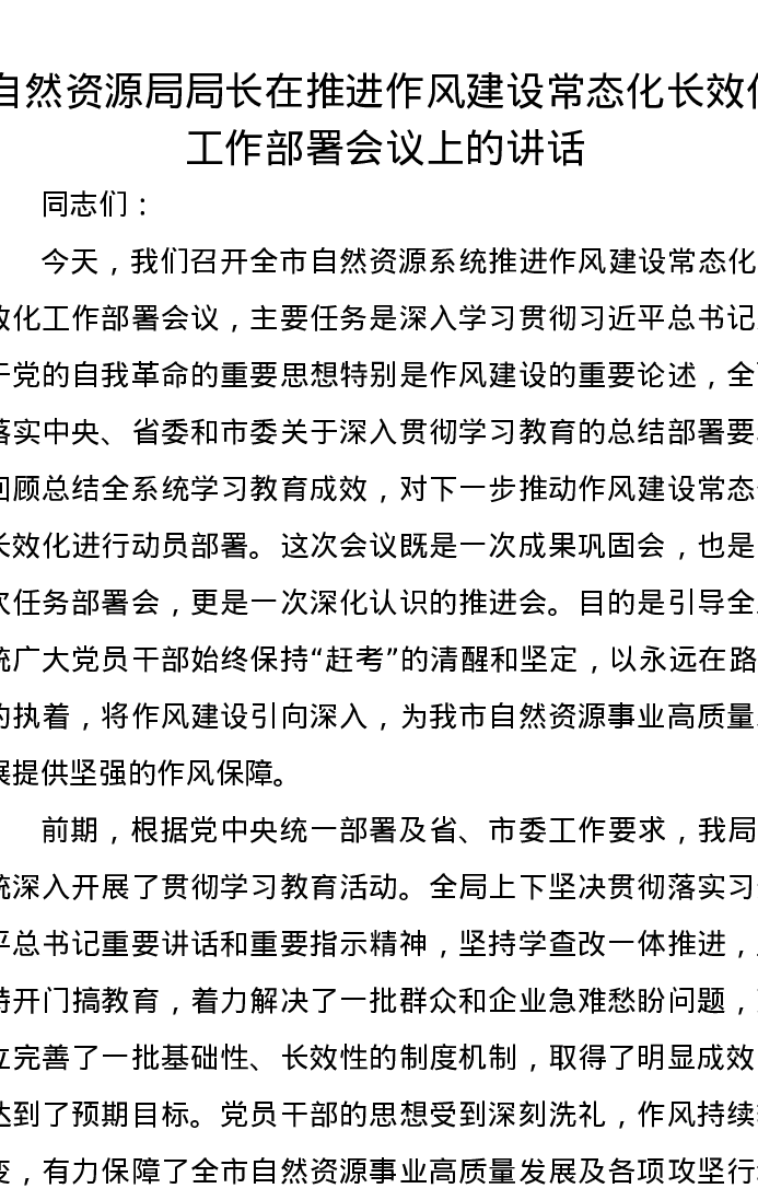 自然资源局局长在推进作风建设常态化长效化工作部署会议上的讲话
