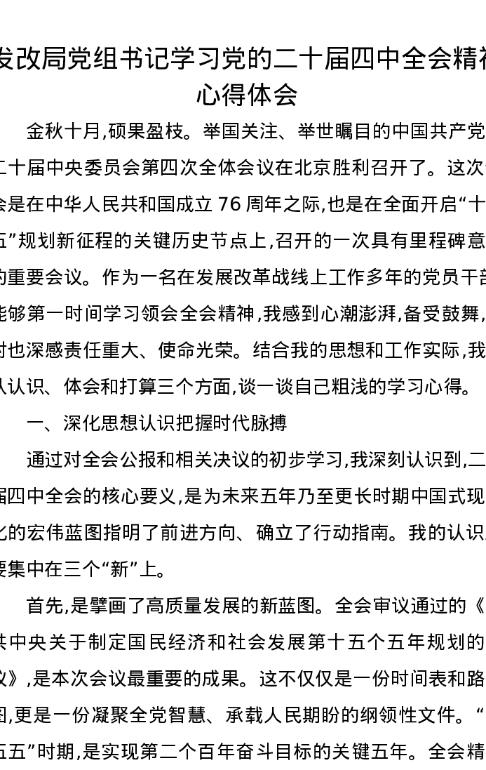 发改局党组书记学习党的二十届四中全会精神心得体会