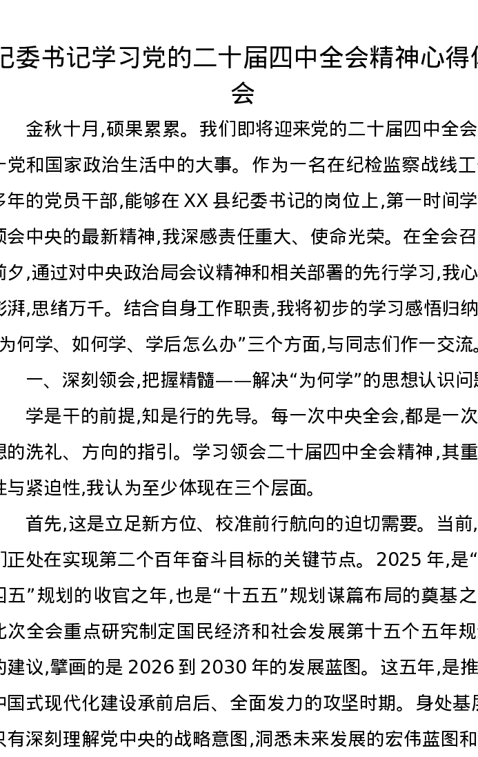 纪委书记学习党的二十届四中全会精神心得体会