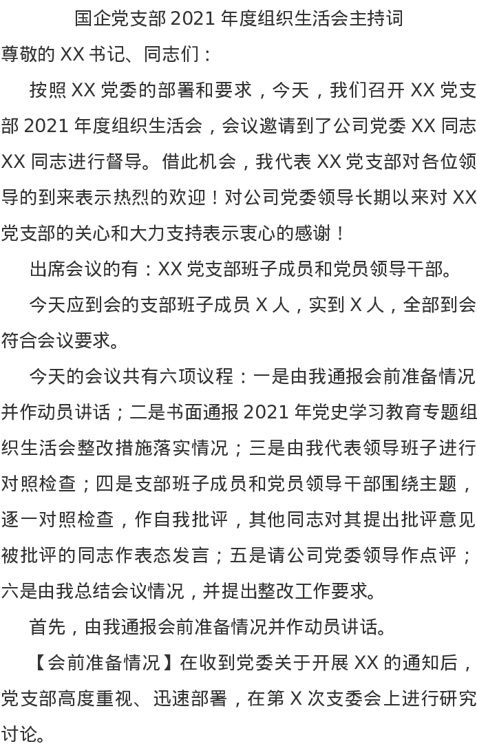 国企党支部2021年度组织生活会主持词(附动员讲话、点评、总结讲话)5550字