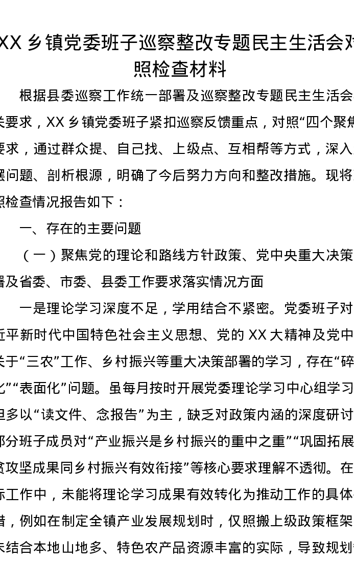 XX乡镇党委班子巡察整改专题民主生活会对照检查材料