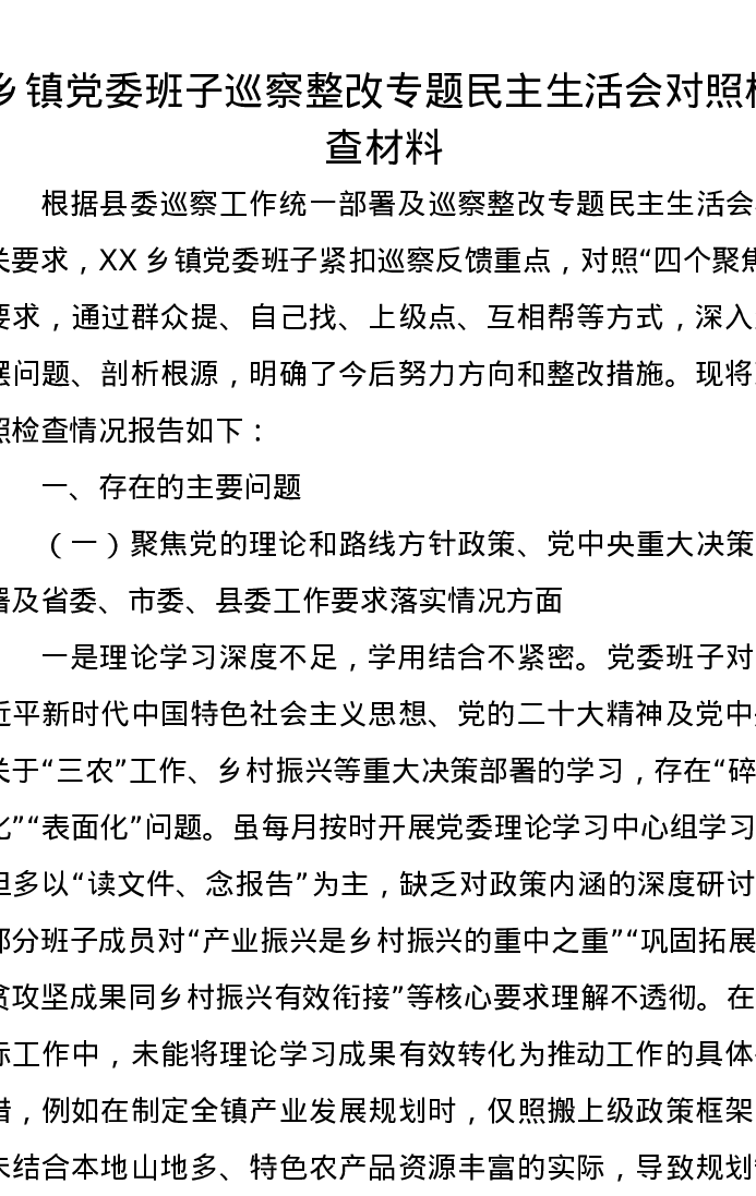 乡镇党委班子巡察整改专题民主生活会对照检查材料