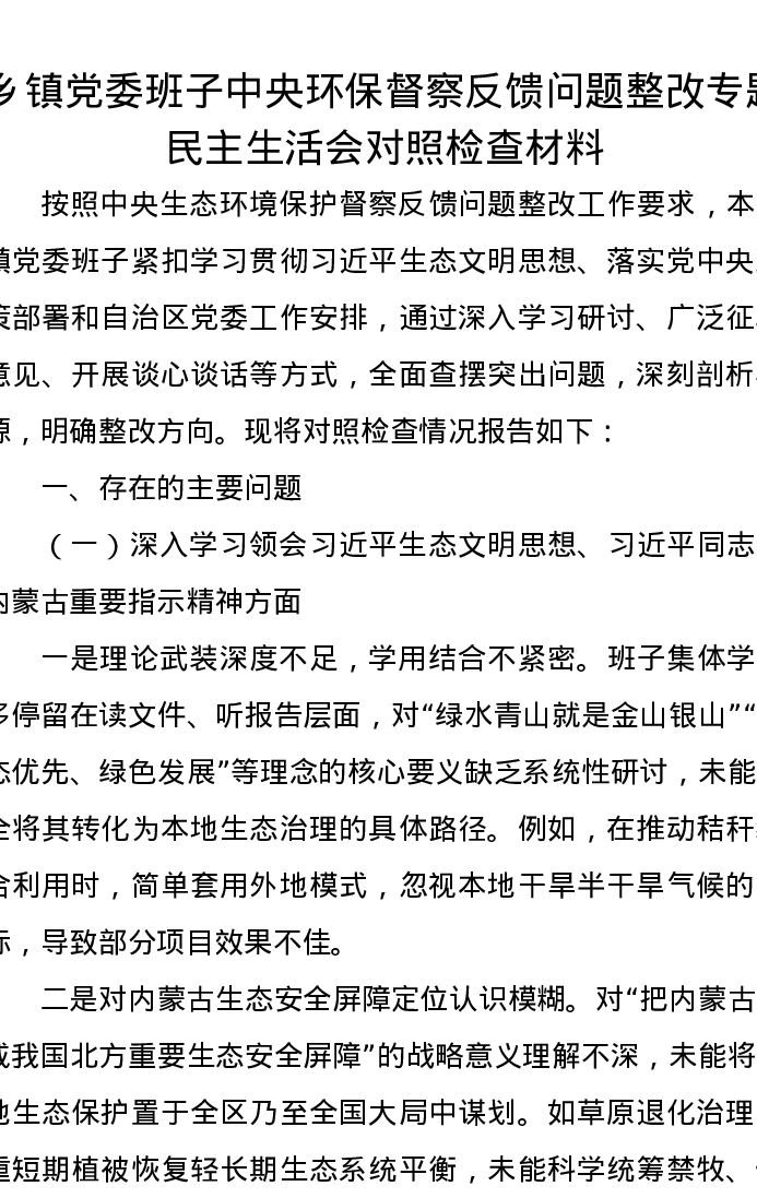 乡镇党委班子中央环保督察反馈问题整改专题民主生活会对照检查材料