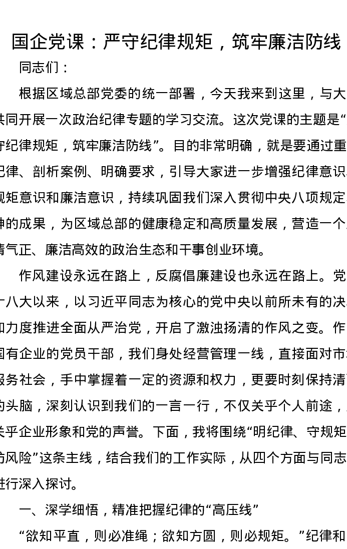 国企党课讲稿:严守纪律规矩,筑牢廉洁防线