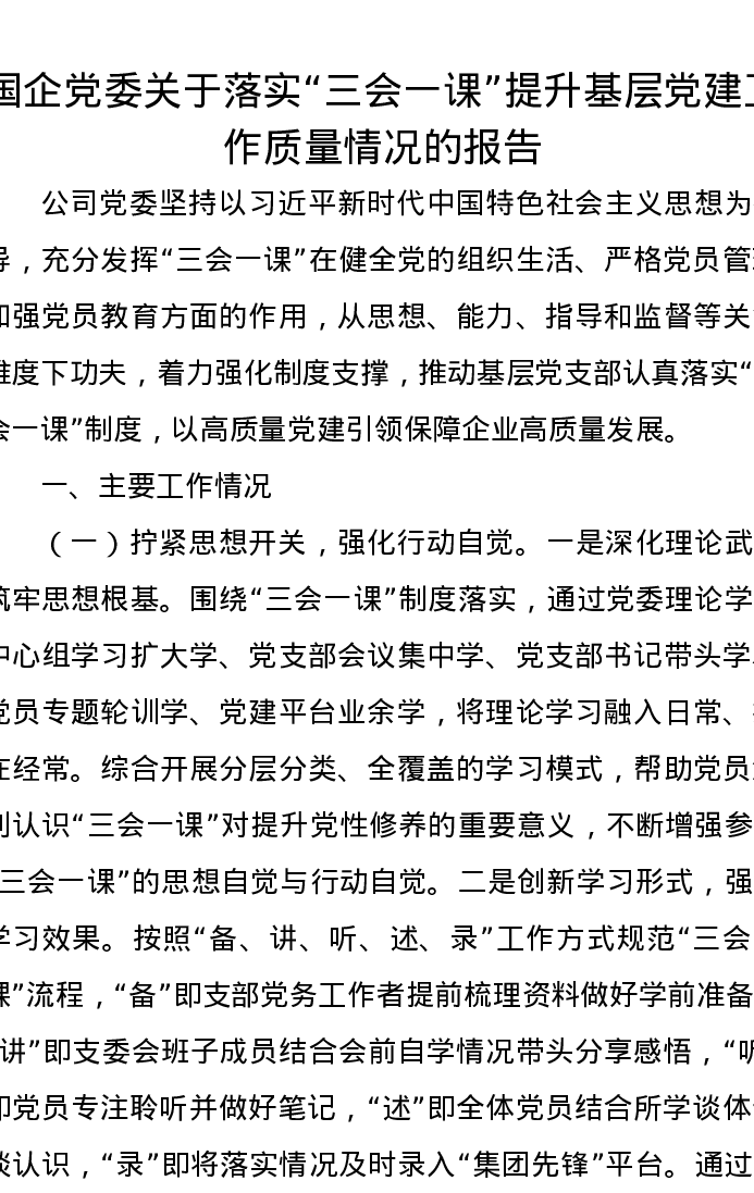国企党委关于落实“三会一课”提升基层党建工作质量情况的报告