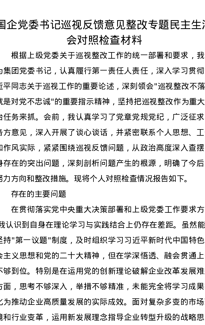 国企党委书记巡视反馈意见整改专题民主生活会对照检查材料