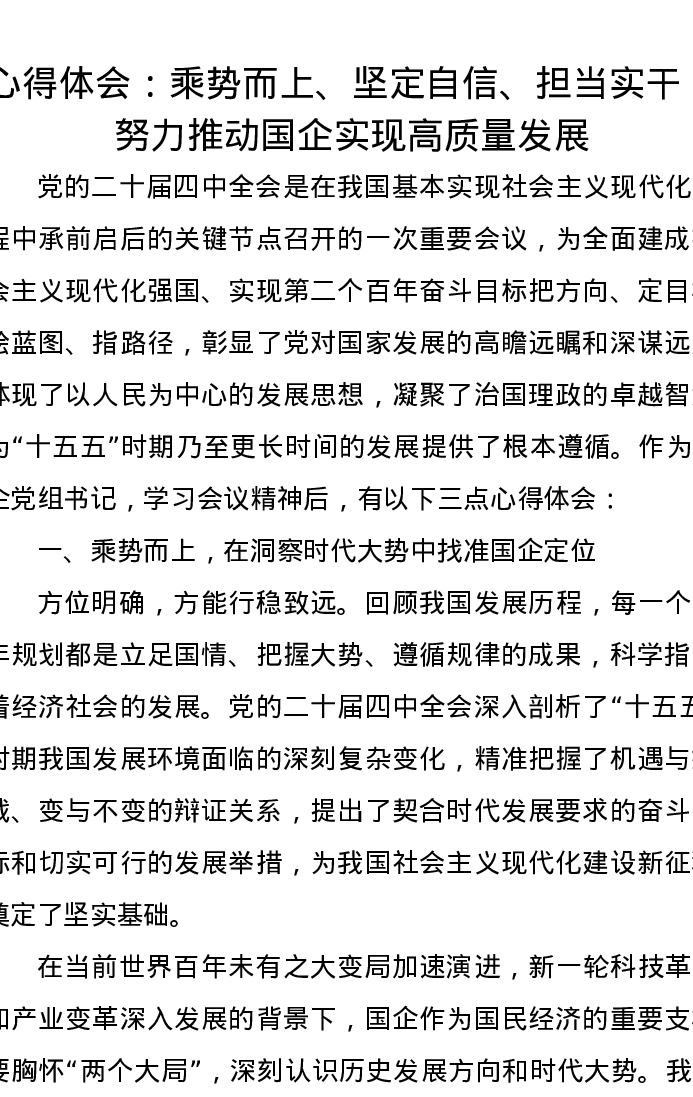 心得体会:乘势而上、坚定自信、担当实干,努力推动国企实现高质量发展
