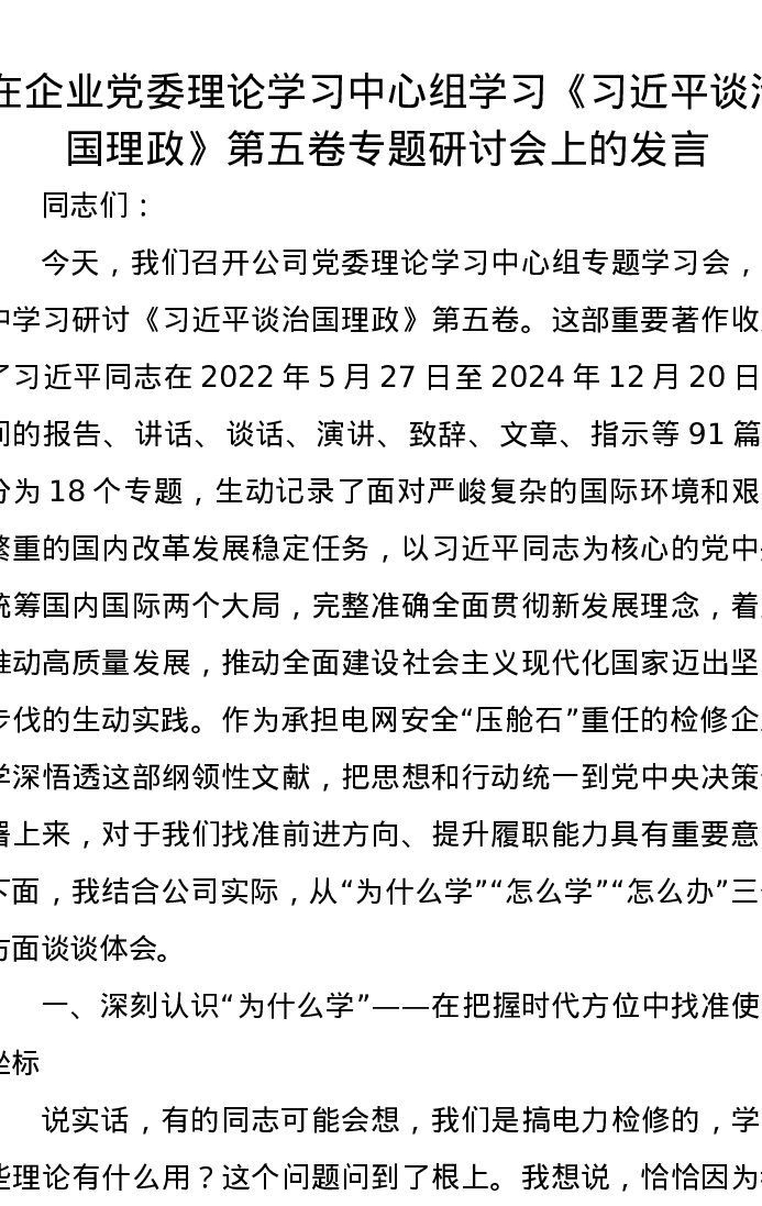 在企业党委理论学习中心组学习《习近平谈治国理政》第五卷专题研讨会上的发言