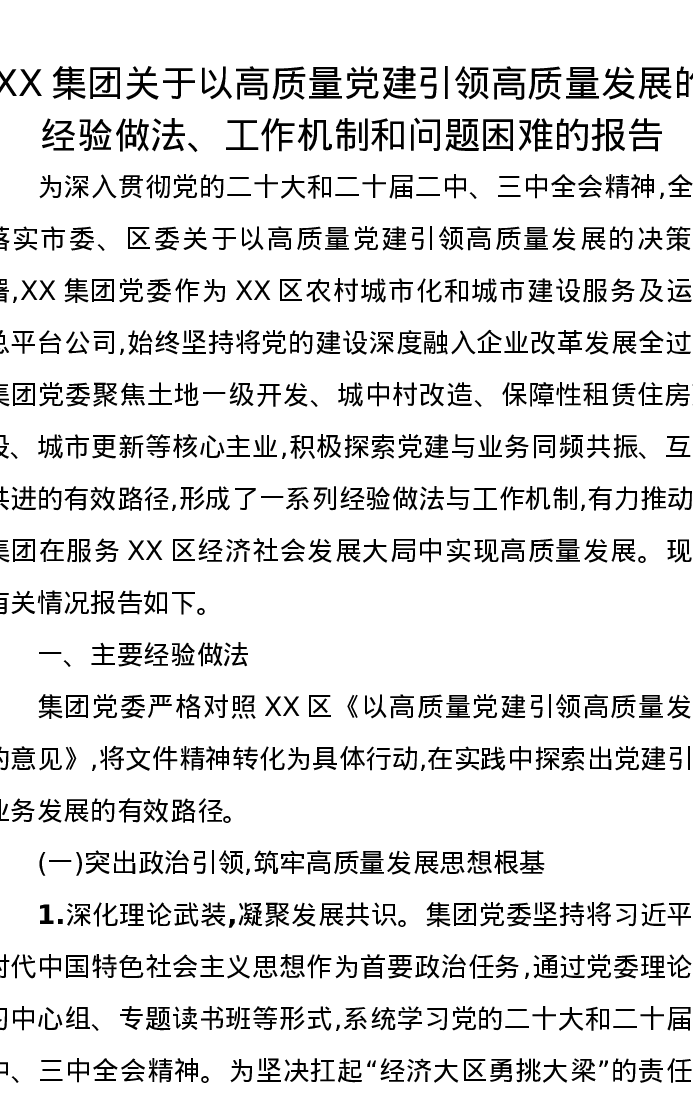XX集团关于以高质量党建引领高质量发展的经验做法、工作机制和问题困难的报告