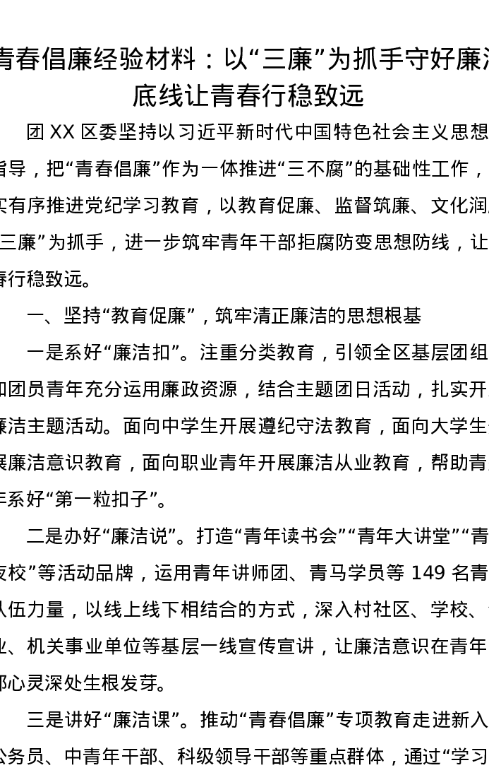青春倡廉经验材料:以“三廉”为抓手守好廉洁底线让青春行稳致远