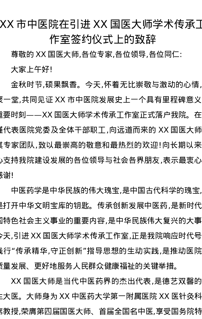 XX市中医院在引进XX国医大师学术传承工作室签约仪式上的致辞
