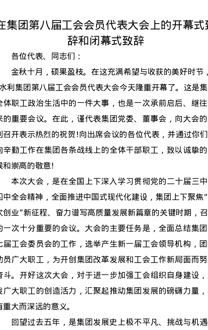 在集团第八届工会会员代表大会上的开幕式致辞和闭幕式致辞