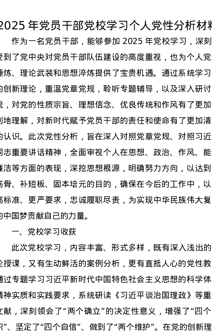 2025年党员干部党校学习个人党性分析报告材料