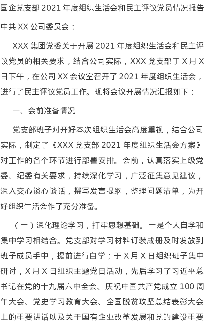 情况报告:国企党支部2021年度组织生活会和民主评议党员情况报告 2820字
