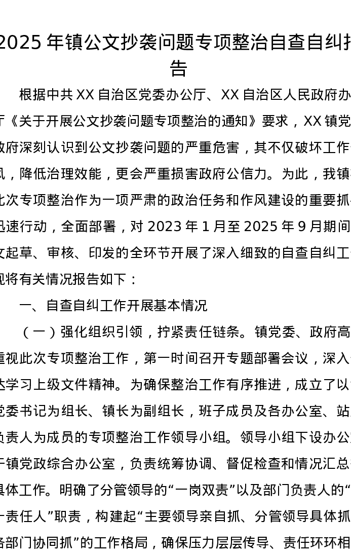 2025年镇公文抄袭问题专项整治自查自纠报告