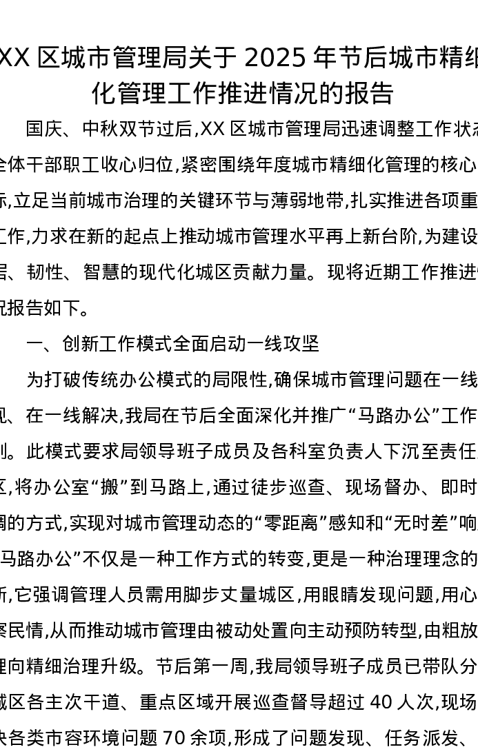 XX区城市管理局关于2025年节后城市精细化管理工作推进情况的报告
