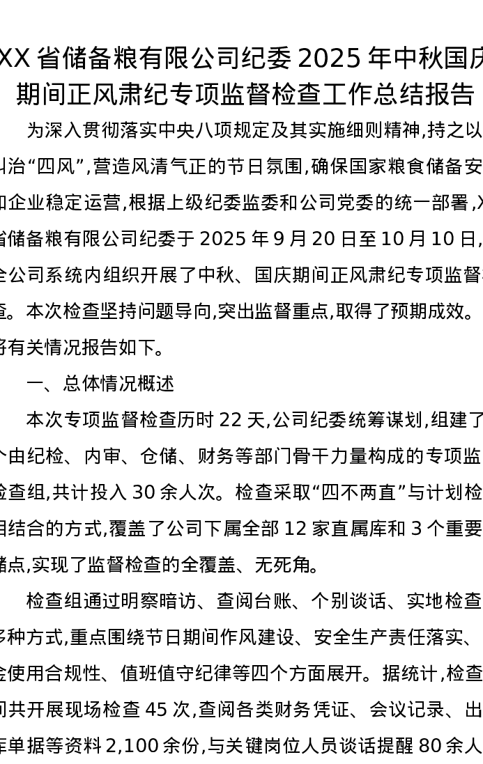 XX省储备粮有限公司纪委2025年中秋国庆期间正风肃纪专项监督检查工作总结报告