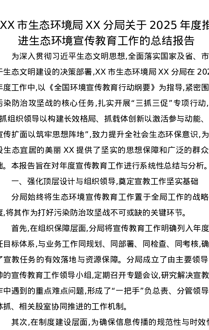 XX市生态环境局XX分局关于2025年度推进生态环境宣传教育工作的总结报告