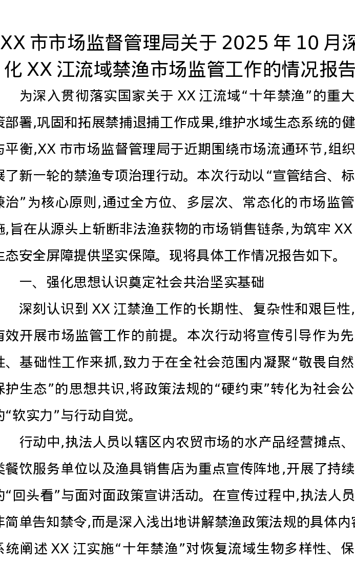 XX市市场监督管理局关于2025年10月深化XX江流域禁渔市场监管工作的情况报告