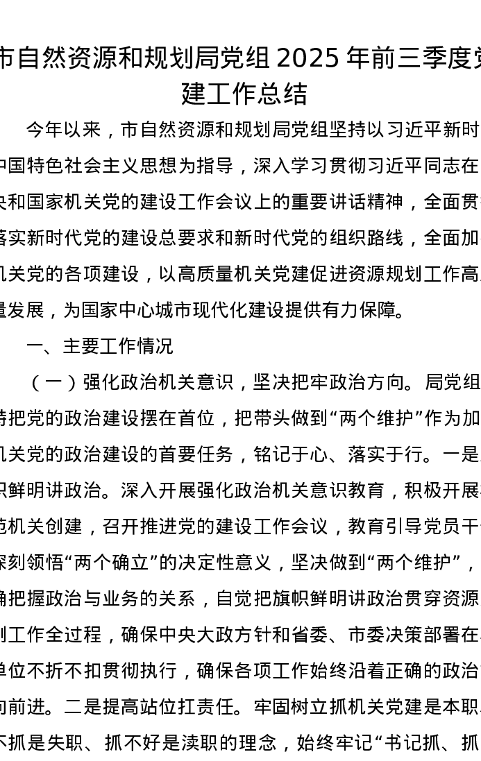 市自然资源和规划局党组2025年前三季度党建工作总结