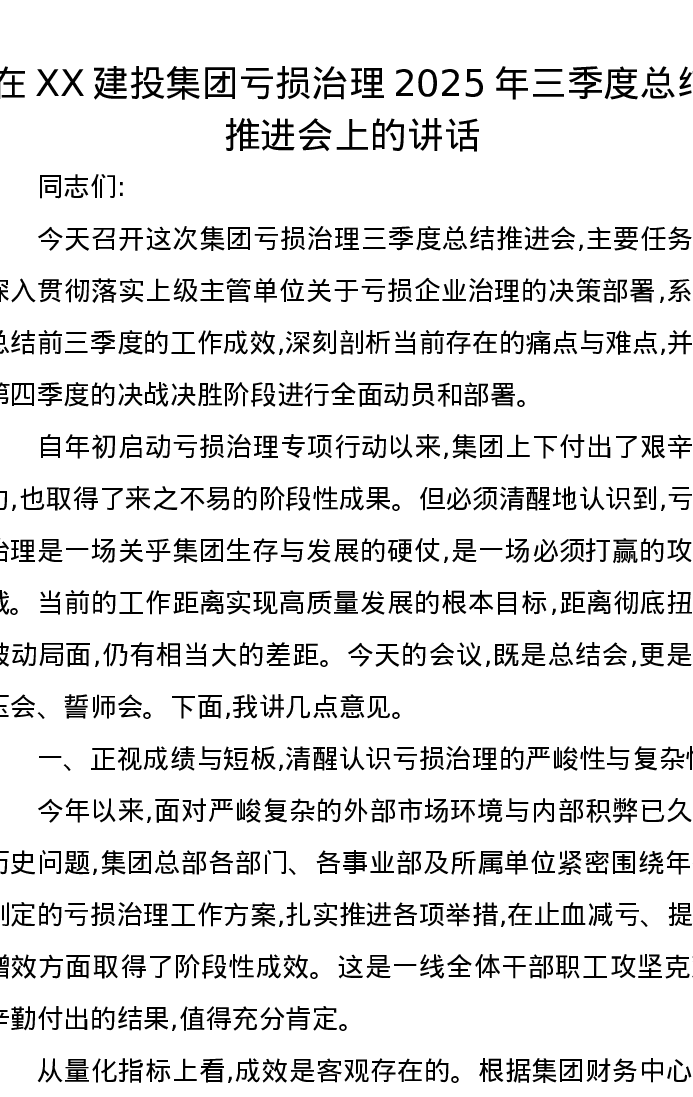在XX建投集团亏损治理2025年三季度总结推进会上的讲话