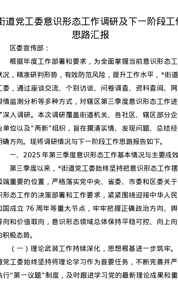 街道党工委意识形态工作调研及下一阶段工作思路汇报