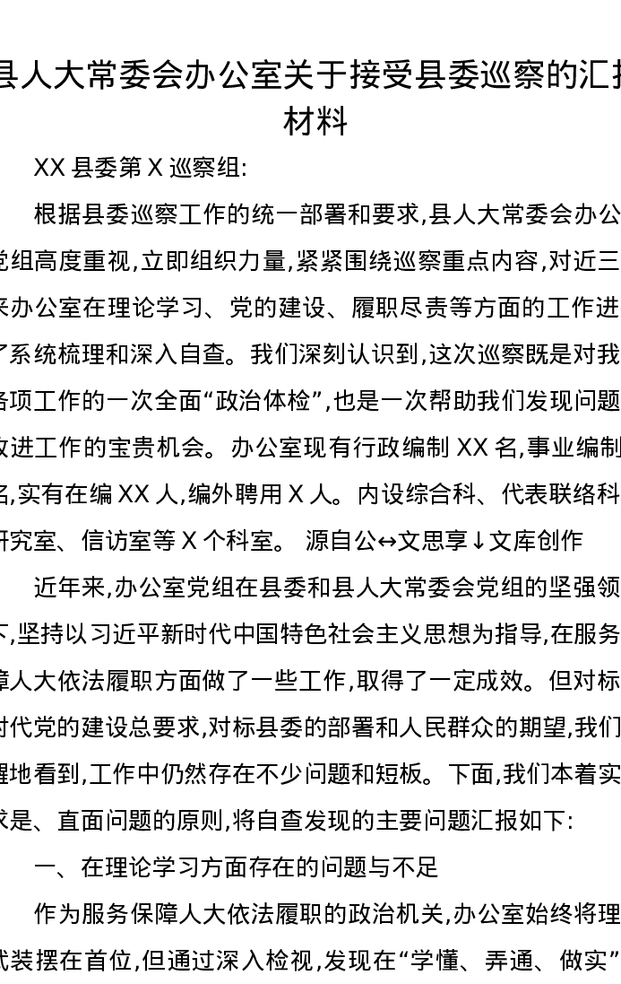 县人大常委会办公室关于接受县委巡察的汇报材料