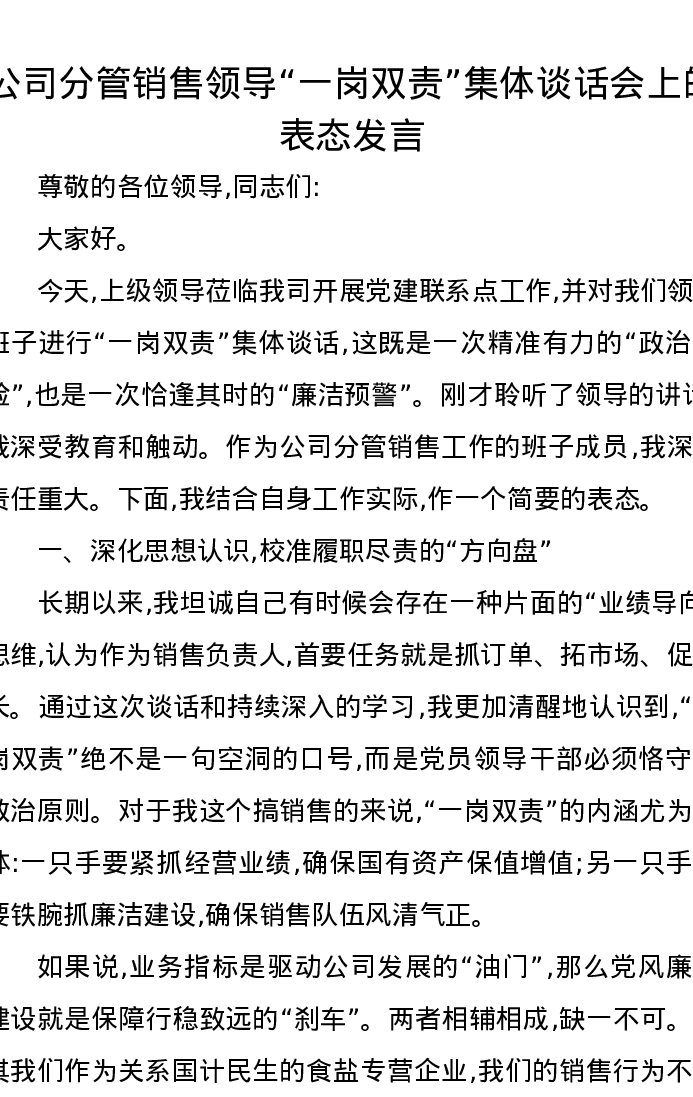 公司分管销售领导“一岗双责”集体谈话会上的表态发言