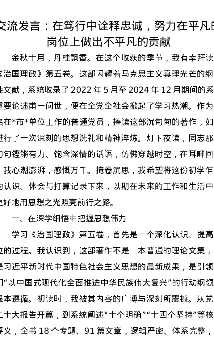 交流发言:在笃行中诠释忠诚,努力在平凡的岗位上做出不平凡的贡献