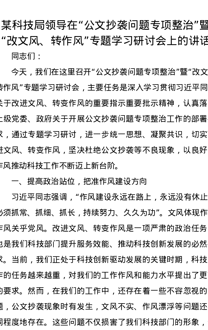 某科技局领导在 “公文抄袭问题专项整治” 暨 “改文风、转作风” 专题学习研讨会上的讲话
