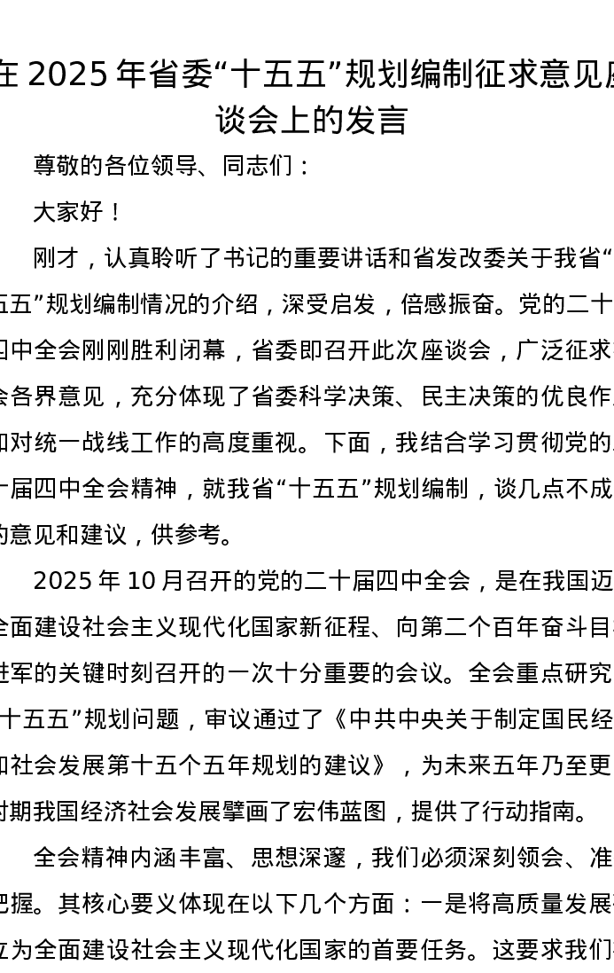 在2025年省委“十五五”规划编制征求意见座谈会上的发言