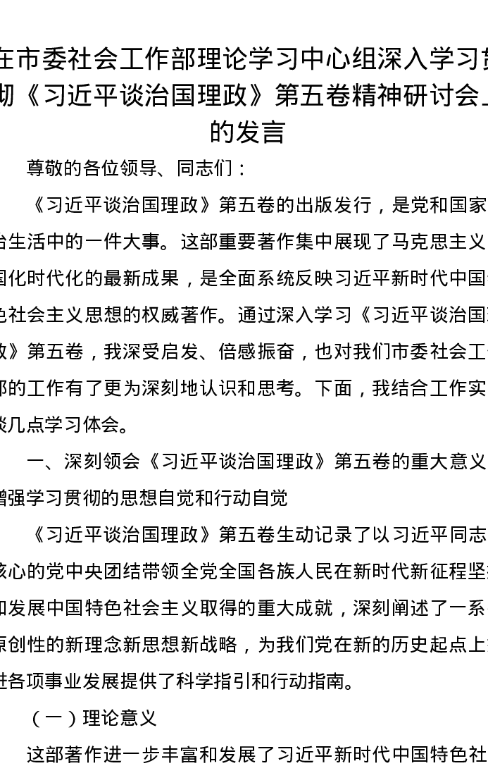 在市委社会工作部理论学习中心组深入学习贯彻《习近平谈治国理政》第五卷精神研讨会上的发言