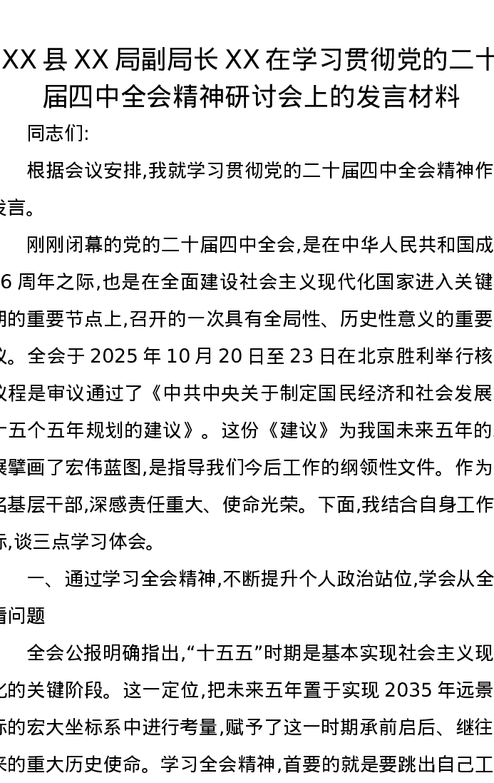 XX县XX局副局长XX在学习贯彻党的二十届四中全会精神研讨会上的发言材料