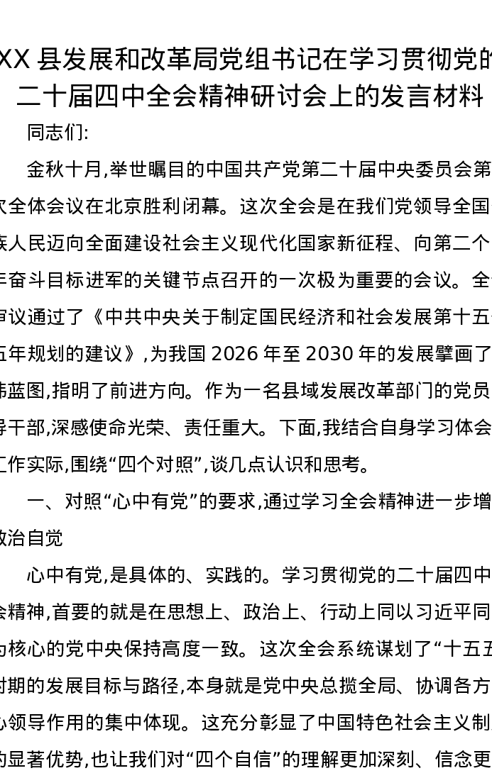 XX县发展和改革局党组书记在学习贯彻党的二十届四中全会精神研讨会上的发言材料