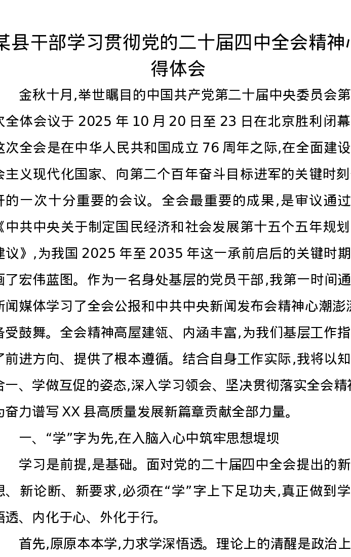 某县干部学习贯彻党的二十届四中全会精神心得体会