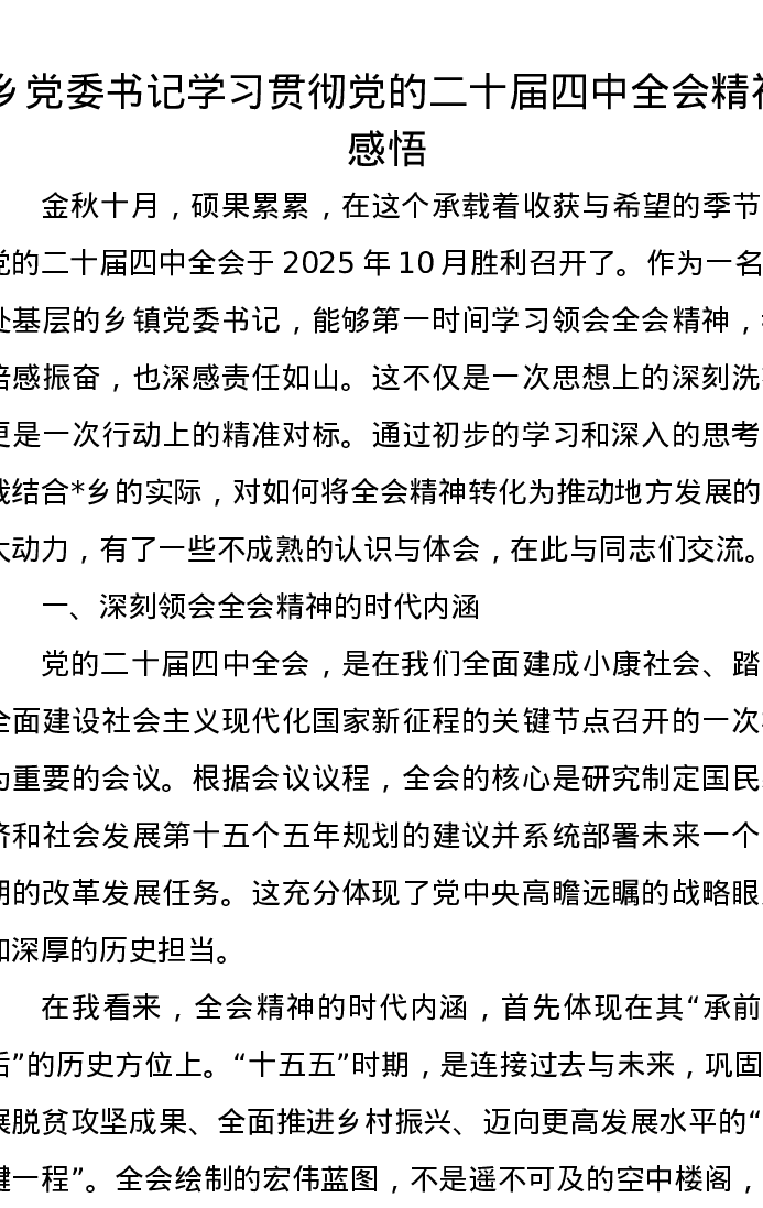 乡党委书记学习贯彻党的二十届四中全会精神心得感悟