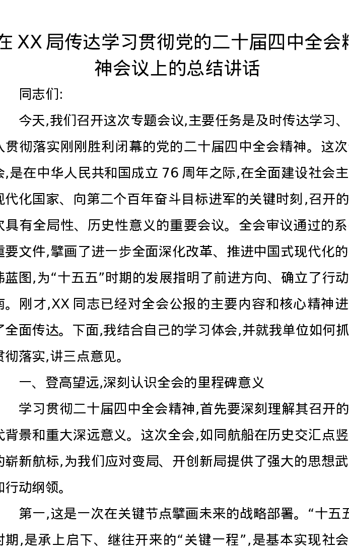 在XX局传达学习贯彻党的二十届四中全会精神会议上的总结讲话