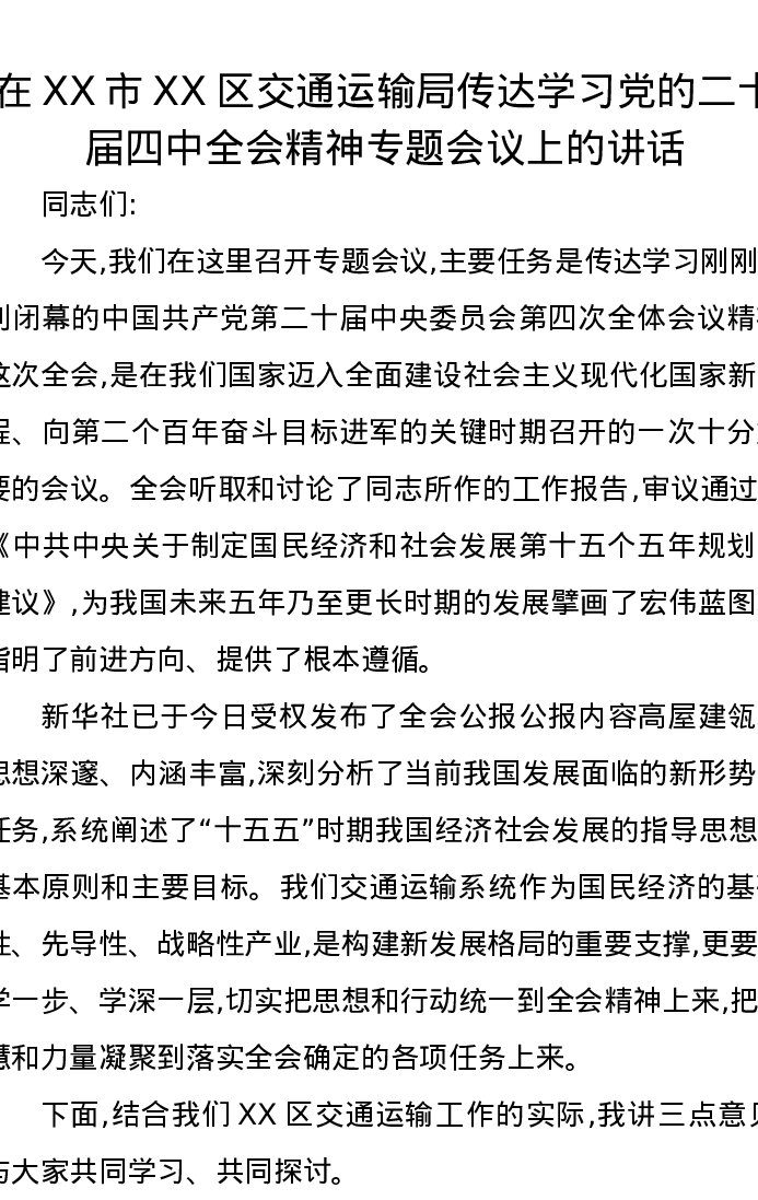 在XX市XX区交通运输局传达学习党的二十届四中全会精神专题会议上的讲话