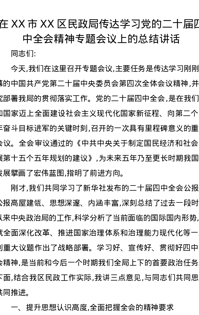 在XX市XX区民政局传达学习党的二十届四中全会精神专题会议上的总结讲话
